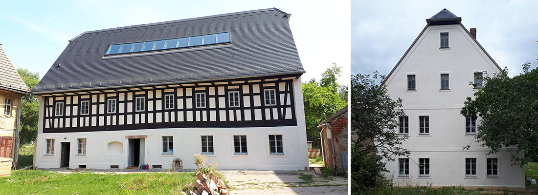 Wiederherstellung der historischen Fassade mit Kalkputz auf Naturstein-/Mauerwerk und Erneuerung der Gefacheputze.